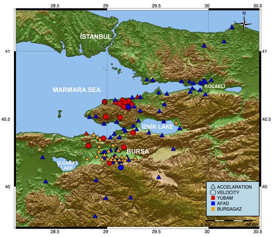 Station distribution in Bursa province and surrounding. The stations of YUBAM, AFAD, and Bursagaz are shown in red, blue, and orange colors, respectively. Triangle and circle refer to the type of sensor.