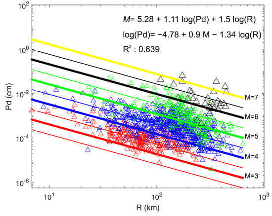 The relationships between , epicentral distance (R), and catalog magnitude (M) calculated for each station. Each triangle is measured at a single site. Here, Pd is in cm, and R is in km. Thick lines are predictions based on Equation (4) for magnitudes 3 (red line), 4 (blue line), 5 (green line), 6 (black line), and 7 (yellow line), and thin lines are for magnitudes 2.5, 3.5, 4.5, 5.5, and 6.5, respectively.