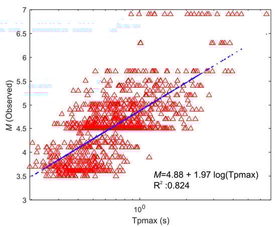 While the estimated magnitude based on using the default equation was 4.2, it was observed that the result of the developed equation was 4.7. Considering the magnitude estimation based on , the developed equation contains a lower error. When the results obtained with is compared, the difference is quite significant (magnitude 3.1 and 4.1, respectively, Table 2). Although the newly developed equation performs an excellent revision over the default equation, the result still contains apparent errors. As some researchers have indicated in previous studies, the reliability of the -based magnitude scaling relationship is better than in our study [,].