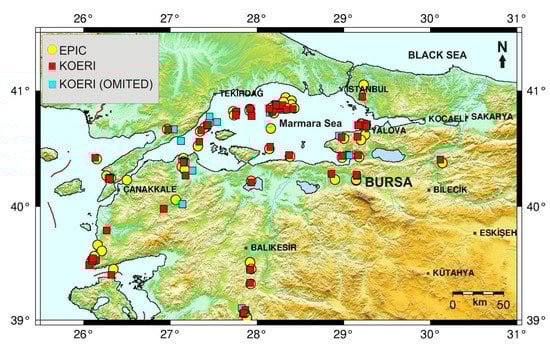 - Gok, E.; Polat, O. An Assessment of the Seismicity of the Bursa Region from a Temporary Seismic Network. Pure Appl. Geophys. 2011, 169, 659–675. [Google Scholar] [CrossRef]