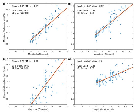 Magnitudes calculated from and versus the observed magnitude (a) magnitudes calculated using default equations for , (b) magnitudes calculated using newly developed for , (c) magnitudes calculated using default for , (d) magnitudes calculated using newly developed for .