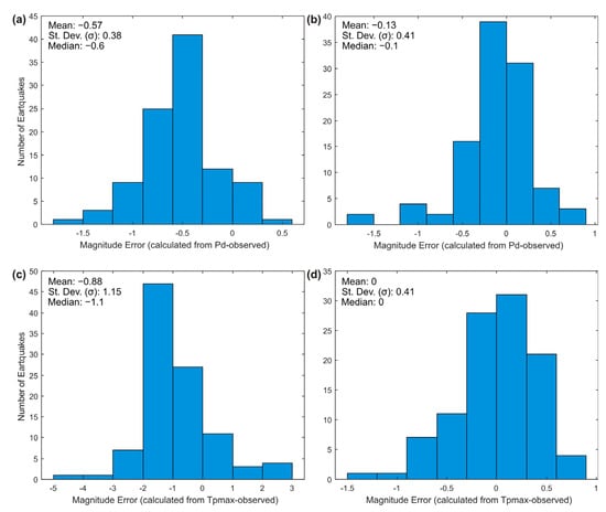 Histograms of errors for play-backed catalog dataset (a) magnitude errors using default equations for , (b) magnitude errors using newly developed for , (c) magnitude errors using default for , (d) magnitudes errors using newly developed for .