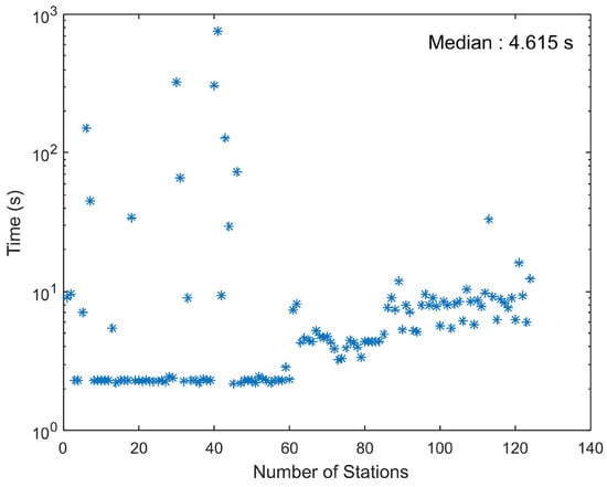 The necessary data for the EEWS in Bursa and its surroundings are provided to YUBAM via AFAD and Bursagaz. However, since the data in the AFAD center passes several data servers and GSM technology is used for communication, latencies of the data are high. The delay time of some stations is more than 800 s due to the malfunction of the GPS. Therefore, when using an overall latency, the most accurate calculation would be to use the median time, measured as 4.6 s. Latencies of the data transmissions in the real-time analysis are given in Figure 8.
