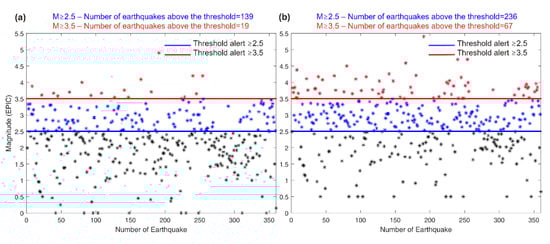 The EPIC system is a useful tool that works in real-time in different regions [,,,] and aims to take precautions against seismic hazards. In short, the system aims to minimize disaster damage by generating warnings for an approaching ground shaking at certain times. EPIC estimates the magnitude using P waves peak displacement () and the dominant period (). The epicenter of the event is located based on the grid search technique after the P wave triggering in at least four stations. The ground shaking can then be estimated using the attenuation relations of the location and magnitude of the event.
