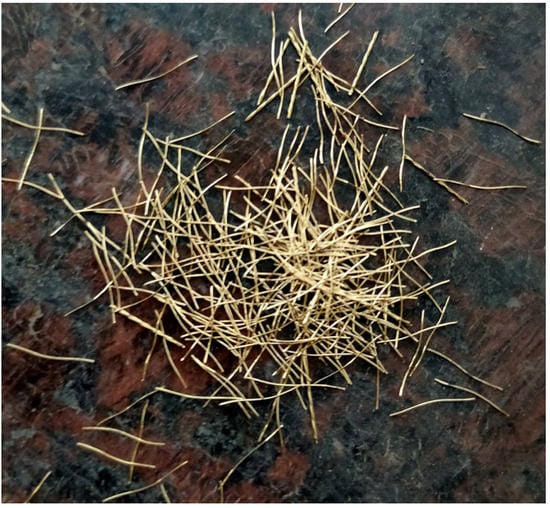 In the present tests, two cuboid UHPC targets are cast for the projectile impact under different striking velocities, as shown in Figure 1. The plain sizes of the two targets are both 2.0 m × 2.0 m, while the thicknesses are 0.9 m and 1.5 m, respectively. Each target is wrapped by 1 cm thick steel plates except for the front and back to weaken the lateral boundary effects. Straight copper-coated steel fibers with 0.2 mm diameter and 13 mm long, as shown in Figure 2, are incorporated into the matrix at a volume content (Vf) of 2%. The yield strength of the steel fiber is 2100 MPa, and the density is 7830 kg/m3.