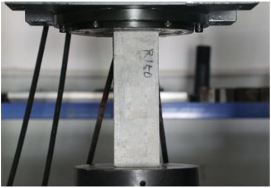 Quasi-static uniaxial compression tests are carried out on prismatic specimens with dimensions of 100 mm × 100 mm × 300 mm using an electro-hydraulic servo testing machine with a capacity of 300 tons to determine the uniaxial compressive strength of UHPC used for targets and corresponding matrixes without steel fibers, as shown in Figure 3. A total of six specimens are tested, three of which are made of UHPC with steel fibers, and the other three are made of UHPC without steel fibers (which can be named as matrix), complying with the test procedure in Chinese Standard GB/T 50081-2019 [19]. Before the compression tests, all prismatic specimens are steam cured using an automatic control system [20]. The experimental uniaxial compressive strengths of UHPC specimens with steel fibers are 144.1 MPa, 152.3 MPa, and 148.6 MPa, respectively, and the results of matrix specimens are 139.8 MPa, 134.5 MPa, and 145.3 MPa, respectively. In the subsequent discussion, the uniaxial compressive strength of UHPC and matrix are taken as the average values of the corresponding three specimens, i.e., 148.3 MPa and 139.9 MPa, respectively. At the same time, the density of UHPC specimens with steel fibers and matrix specimens is also measured, and the average values are 2430 kg/m3 and 2237 kg/m3, respectively.