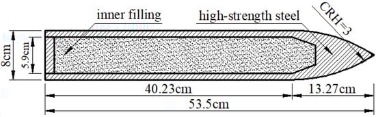 The projectile is a type of tangent ogive-nose projectile with a caliber of 8 cm (d = 8 cm), and detailed dimensions are shown in Figure 4. The projectiles are composed of the outer shell and inner filling, and each weighs 11.9 kg. The outer shell is made of high-strength steel; the yield strength is 1350 MPa. In order to facilitate the launch of the projectiles, the centering ring and sabot are attached to each projectile.