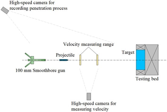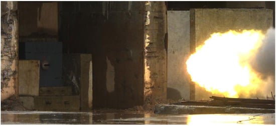 Figure 5 shows the test setup of the penetration tests. A 100 mm smoothbore gun is used to launch the projectiles. The targets are placed vertically on the testing bed. Some thick normal concrete blocks are placed tightly on the back of the targets to restrain the rigid body displacement in the thickness direction of the targets. The smoothbore gun barrel is adjusted to be perpendicular to the front of the targets to ensure that the projectiles can strike in the center of targets vertically. During the flight of projectiles, the centering rings and sabots would automatically separate from the projectiles, so the impact mass (m) is 11.9 kg. Two sets of high-speed photography equipment are used to measure the actual striking velocity of the projectile (V0) and to capture the penetration process.