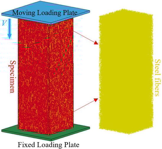 The typical mesoscale finite element model for prismatic specimens under uniaxial compression is shown in Figure 9. The specimen is placed on a fixed loading plate, and the load is applied to the specimen by imposing displacement on the moving loading plate. An automatic surface-to-surface contact algorithm considering the friction effect is adopted to simulate the contact behavior between the loading plate and the specimen. The solid element SOLID164 is used for modeling the matrix of the specimen and loading plates. The steel fibers are modeled by beam element BEAM161. The keyword *CONSTRAINED_BEAM_IN_SOLID (CBIS) [25] in LS-DYNA is adopted to simulate the bond-slip behavior between steel fibers and matrixes.