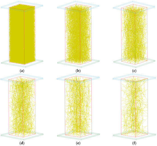 Distribution of steel fibers in matrix with different n: (a) n = 1, 146,913 beam elements; (b) n = 3, 5442 beam elements; (c) n = 4, 2296 beam elements; (d) n = 5, 1176 beam elements; (e) n = 6, 681 beam elements; (f) n = 7, 429 beam elements.