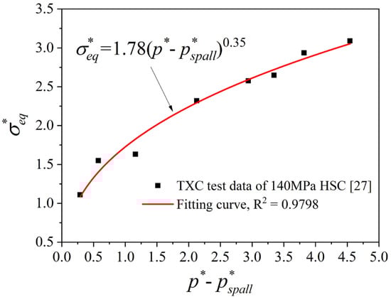 Without adding steel fibers, the UHPC matrix could be regarded as high-strength concrete, modeled by the RHT model [26] in the present study. The critical RHT failure surface parameters Afail and Nfail are determined by fitting the triaxial compression test data of 140 MPa HSC in Reference [27], as shown in Figure 11, where Afail and Nfail are 1.78 and 0.35, respectively. The other critical parameters are self-defined according to Refs. [10,28,29]. Due to the stiffness of loading plates in practice being much larger than that of the specimen, the loading plates are modeled as a rigid body with the material model *MAT_RIGID. The isotropic and kinematic hardening material model *MAT_PLASTIC_KINEMATIC (*MAT_003) is chosen to build the steel fibers. Parameters of material models used in the uniaxial compression simulations are listed in Table 3.