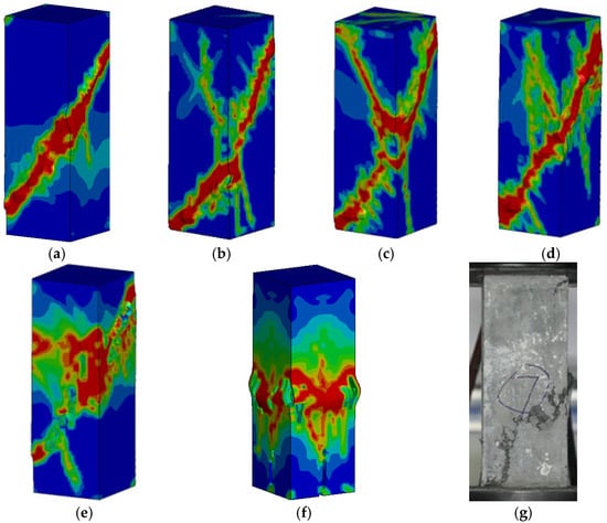 The numerical failure modes of specimens under different amplification factors n are shown in Figure 12. For the cases of n = 1, 3, 4, 5, the specimens exhibit ductile shearing failure modes, where a main oblique crack develops from the end of the specimen to the middle in the direction of about 45 degrees, which is the same as the typical experimental failure mode shown in Figure 12g. However, for the case of n = 6 and n = 7, the failure mode is quite different from the other cases and the experimental result, where the damage occurs firstly in the middle of the specimen and is approximately concentrated in the middle, which displays as brittle splitting failure mode to a certain content. Shearing failure is a type of ductile failure, while splitting failure belongs to brittle failure. Although the volume percentage of steel fibers is the same, the failure mode tends to change from ductile failure to brittle failure with the increase of the amplification factor. The difference between failure modes under different amplification factors indicates that steel fibers greatly influence the ductility of UHPC.