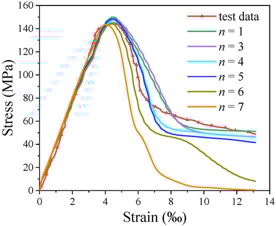Figure 13 shows the uniaxial compressive curves with different amplification factors n and the average full stress-strain curve obtained from uniaxial compression tests. There is little difference in the ascending branches of stress-strain curves obtained from the numerical simulations under different amplification factors, and all the ascending branches are in good agreement with the test data. As for the descending branches of the stress-strain curves, the numerical results of n = 1, 3, 4, and 5 are in good accord with the test data. Nevertheless, for the cases of n = 6 and n = 7, the numerical descending branches drop more sharply than the other cases and have much lower residual strength, which presents a great difference from the experimental result. If taking the area under the full stress-strain curve of uniaxial compression as an index to characterize the toughness of specimens, Figure 13 shows that the toughness decreases with the increase of the amplification factor. The variation of the toughness index caused by the change in amplification factor shows that steel fiber influences the toughness of UHPC significantly.