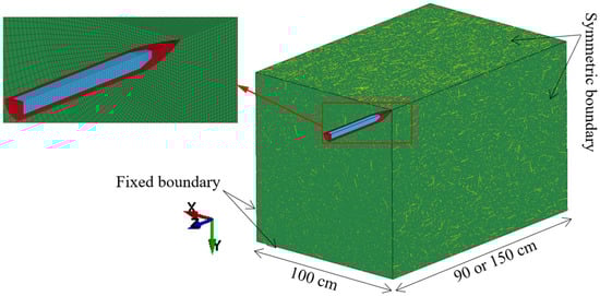 Since no obvious yaw phenomenon is observed in the penetration process, quarter finite element models based on the equivalence method are established, as shown in Figure 14. The keyword *CONSTRAINED_GLOBAL is used to simulate the symmetric boundary condition by defining two global boundary constraint planes. As for the outer surfaces of targets, the fixed boundary condition is imposed according to the experimental setup. Matrix elements (SOLID164) within five times the projectile diameter are refined, and the minimum matrix element size is 0.8 cm. There are 352,512 steel fiber elements (BEAM161) uniformly distributed in the target with 90 cm thickness and 587,571 steel fiber elements in the target with 150 cm thickness. The outer shell and inner filling of the projectile are modeled by the solid element SOLID164 and are connected by joint nodes. The eroding surface-to-surface contact algorithm is used to simulate the contact behavior between the projectile and matrix.