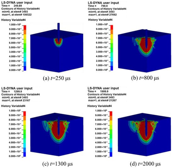 Figure 15 shows the numerical results of the penetration process for U-1, where the striking velocity is 410 m/s and the target thickness is 90 cm. The “History Variable #4” refers to the damage parameter D in the RHT model, where D = 0 means no damage and D = 1 means fracture of the material. It can be seen that severe damage mainly occurs around the ballistic trajectory, and the region of damage distribution expands as penetration depth increases.