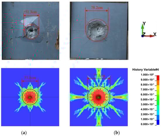 Comparison of frontal damage between the experimental and numerical results; (a) U-1, 410 m/s; (b) U-2, 664 m/s.