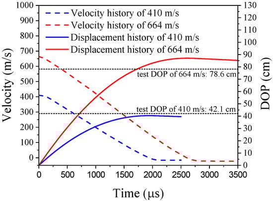 The time-displacement curves and time-velocity curves of the projectiles are shown in Figure 17. The numerical values of DOPs at striking velocities of 410 m/s and 664 m/s are 40.4 cm and 87.1 cm, respectively. The numerical results and experimental results of DOPs are compared in Figure 18, where the relative errors are −3.8% and 11.7%, respectively. The reason for the slightly larger error in the case of 664 m/s may be that the projectile has a slight yaw, as shown in Figure 7b. Although the yaw is not obvious, it could increase the resistance of the projectile penetration into the target and then reduce the DOP. The maximum relative error of the DOP is lower than 15%, which indicates that the numerical method could reasonably predict the DOP when projectiles penetrate UHPC targets. Figure 17 shows that the velocities of the three projectiles gradually decrease from positive values to negative values with the increase of the DOP. The negative values of the velocities mean that the projectiles bounce in the opposite direction, which is consistent with the experimental phenomenon. The rebound velocities of projectiles at striking velocities of 410 m/s and 664 m/s are 16.7 m/s and 22.6 m/s, respectively.
