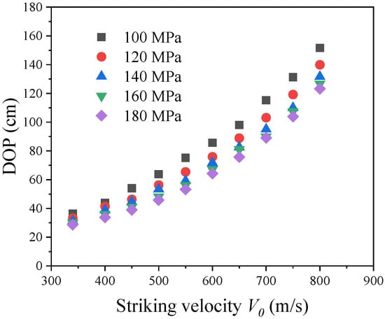 As shown in Figure 19, the DOP decreases with increasing compression strengths of UHPC targets when the striking velocity is fixed. Comparing the numerical results of UHPC targets under projectile penetration with the striking velocity at 550 m/s, where DOPs of 100 MPa, 120 MPa, 140 MPa,160 MPa, and 180 MPa targets are 75.2 cm, 65.4 cm, 59.2 cm, 56.1 cm, and 53.2 cm, respectively, it can be observed that the increments between the adjacent compression strength are 9.8 cm, 6.2 cm, 3.1 cm, and 2.9 cm, respectively, showing a decreasing trend. Hence, the enhancement of compression strength contributes to improving the resistance of the UHPC target against projectile penetration. However, it should also be noted that the improvement effect diminishes with increasing compression strengths.