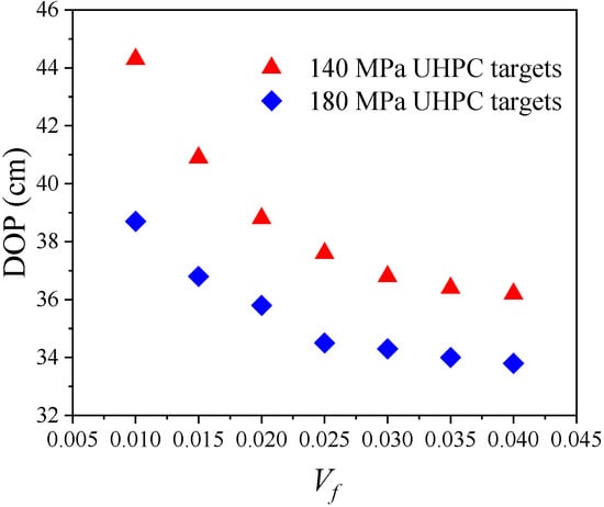 Figure 19 shows the DOPs of 140 MPa and 180 MPa UHPC targets with volume percentages of steel fibers of 1.0%, 1.5%, 2.0%, 2.5%, 3.0%, 3.5%, and 4.0%, where the striking velocity is 400 m/s. No matter the UHPC target of 140 MPa or 180 MPa, the DOP decreases with the increasing volume percentage of steel fibers. DOPs into 140 MPa UHPC targets with 1.0% and 4.0% Vf is 44.3 cm and 36.2 cm, respectively, where the 3% increase in the volume percentage of steel fibers results in an 18.3% decrease in the DOP. For the 180 MPa UHPC targets, the corresponding DOPs are 38.7 cm and 33.8 cm, respectively, and the decrease in the DOP is 12.7%. It can be seen from Figure 19 that when Vf increases from 3% to 4%, the reduction in the DOP is not obvious, which demonstrates that there is a limit to reducing the DOP by adding more steel fibers.