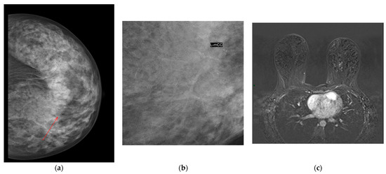 45-year-old woman with BRCA1 and 2 mutations and mammographic evidence of a cluster of pleomorphic calcifications in the internal quadrants of the left breast (a,b). No sonographic findings were reported. MRI revealed an irregular area of non-mass enhancement (c). Stereotactic biopsy confirmed lesion as an atypical ductal hyperplasia. The arrow explains the location of microcalcifications.