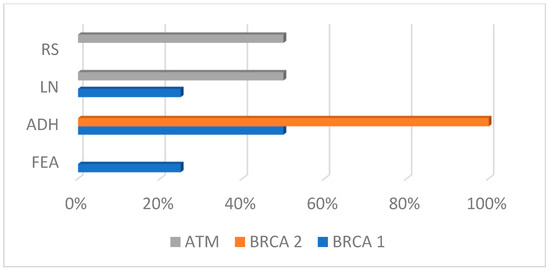 In the ATM group, 50% of lesions were LN and 50% RS; in the BRCA1 group, 25% were FEA, 50% ADH and 25% LN; and in the BRCA2 group, 100% were ADH (Scheme 1).