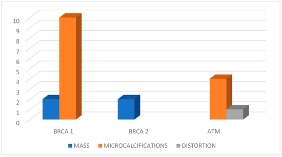 In the BRCA1 group, 10 of the 12 detected lesions (83.3%) appeared as microcalcifications, and 2 (16.7%) as a mass. In the BRCA2 group, 100% of lesions appeared as a mass.