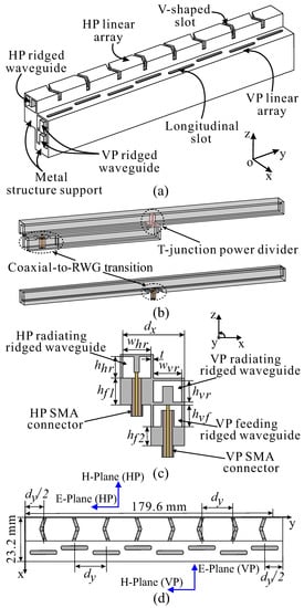 For the WSAAs, the radiating slots should be arranged with an element spacing of 0.5 along the x and y directions for uniform illumination. In our design, for simplicity, both VP and HP arrays are configured to have the same guided-wavelength . Therefore, the slot element spacing is set as = = 0.5= 0.5 = 0.5, where and are the guide wavelengths in the radiating waveguide of the VP and HP array, respectively. As shown in Figure 1d, the two ends of the radiated waveguide are terminated by two metal plates representing the short circuit, with the distance to the center of the last slot being . Finally, the aperture size of the proposed dual-polarized RWSAA is 23.2 × 179.6 mm.