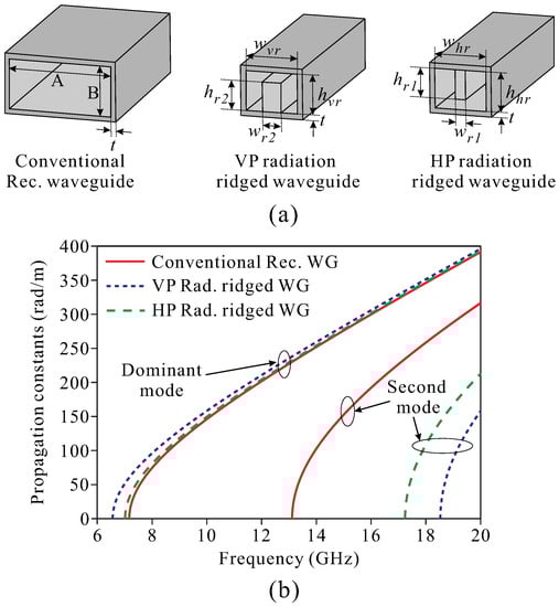 Since the distance between the waveguides is limited to less than one wavelength, ridge loading should be used to achieve the required guided wavelength without exceeding the waveguide width limit. Two RWGs for VP and HP are proposed for dual-polarized arrays to miniaturize the waveguide dimensions and reduce the distance between elements in the array. The RWG width is limited by two factors: The first is that the effective operating bandwidth of the RWG is defined as the frequency range between the two cutoff frequencies in the fundamental propagation mode (dominant mode and second mode). The second is the distance of the adjacent linear arrays with respect to the radiation so that no grating lobes appear when the beam is scanned.