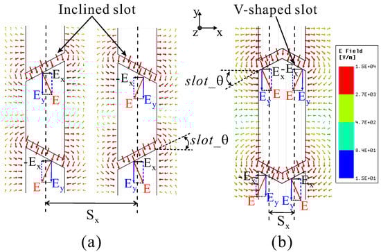 Figure 3 depicts the electromagnetic (EM) field distributions of the two proposed slot types for HP. It can be seen that the surface EM distribution for the inclined slots cutting into the ridged sidewall of the RWG is similar to that on the narrow wall of a conventional waveguide, and the radiated electric field of the V-shaped slot is a combination of a pair of inclined slots on the ridged side wall of the RWG. For each certain angle of inclination (), the slots have an EM field distribution E in two directions perpendicular to the coordinate axes and corresponding to VP and HP.