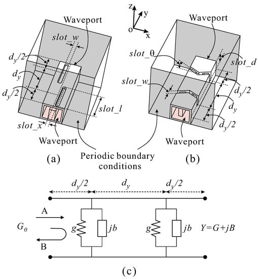 A scattering analysis mechanism is required to control the radiated amplitude and phase of the slots, including the slot offset (), slot length (), slot depth (), and inclined angle (). The slot scattering matrix obtained after unit cell simulation is analyzed to derive the equivalent circuit parameter . The value y, which normalizes the characteristic admittance of the transmission line is given by the components of the two-port scattering matrix as follows: .