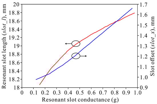 For the longitudinal slots in the VP array, the iterative approach to find a valid set of initial slot parameters is as follows: an appropriate offset is chosen to perform a slot-length parameter sweep to obtain values for the normalized conductance and resonance length at the design frequency. The curves about versus and the obtained results for normalized resonant conductance g are summarized in Figure 6.