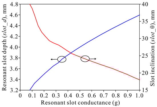 Parameter extraction curves of the resonant slot cutting depth and inclined angle versus the resonant slot conductance for the HP array.
