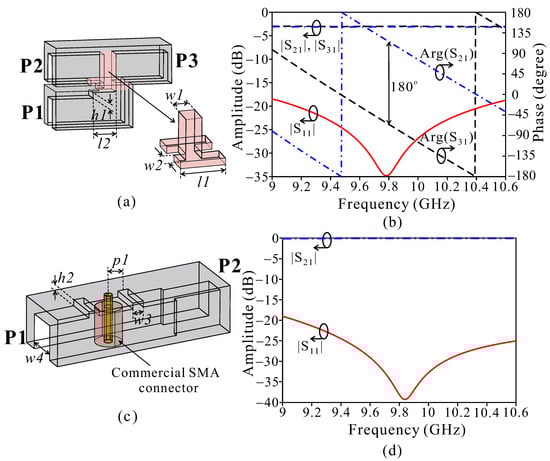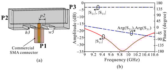The ridge height is properly increased in the proximity of the coupling slot to increase the equivalent capacity of the transmission line and, thus, reduce its impedance. The results of the power divider in Figure 8b show good impedance matching < −22 dB, and the out-of-phase simulate is 180° for the two output ports achieved over the full design frequency band of 9.4–10.2 GHz. Then, a coaxial-to-RWG transition is applied to use the SMA connector feed for the VP array as shown in Figure 8c. The RWG is directly excited by the coaxial probe through a transition with a wideband short circuit and an impedance matcher with two irises symmetrically across the center of the coaxial probe above the ridge.