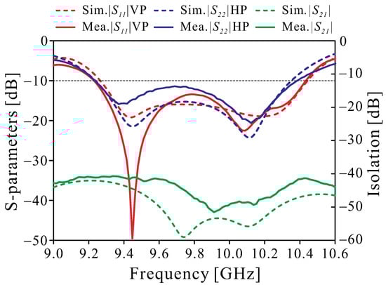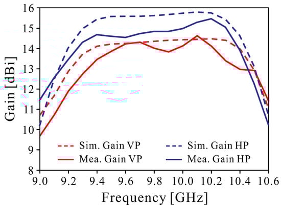 Figure 11 illustrates the measured and simulated results of the reflection coefficients versus frequency. The measured −10 dB impedance bandwidths were 9.24–10.44 GHz (12.2%) for the VP array and 9.26–10.36 GHz (11.2%) for the HP array, while the simulated results were 9.27–10.44 GHz () and 9.26–10.33 GHz () for the VP and HP arrays, respectively. The isolation in both the measured and simulated results between the input ports of the two polarization arrays is better than 40 dB in the operating bandwidth. The measured and simulated realized gains in the broadside direction versus the frequency are illustrated in Figure 12. Within the impedance bandwidth, the measured realized gain of VP was from 12.5 to 14.6 dBi and, of HP, was from 13.5 to 15.5 dBi, which is lower than the simulated gain from 0.5 to 1 dBi. There is a slight deviation between the simulation and measurement results, which is mainly due to manufacturing errors. As in the 3-D printing fabrication process, additional losses due to surface roughness and geometrical tolerances in T-junction and radiation slots cannot be avoided.