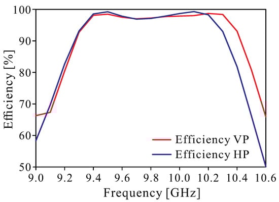 To see the effectiveness of electromagnetic wave radiation, another important parameter to be considered is the antenna efficiency. Figure 13 indicates the variation in the total antenna efficiency of the dual-polarized array with respect to frequency. From the figure, it can be seen that the efficiency of the antenna in both VP and HP polarization is almost uniform, and over 90% is achieved in the impedance bandwidth. Therefore, the antenna has good radiation efficiency and reduces the loss encountered while radiating.