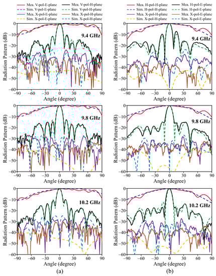 Figure 14 compares the measured and simulated results of normalized radiation patterns at three different frequencies of 9.4, 9.8, and 10.2 GHz in both the E plane and the H plane. The measurement was performed at elevation angles ranging from −90° to +90°, for V and H polarizations along with cross-polarization. It can be seen that the measured radiation patterns have good agreement with the simulation. Due to the center feed structure, the main beam direction in the E and H planes stays in the broadside direction at all three frequencies. The radiation pattern of the VP array is shown in Figure 14a with measured first sidelobe levels in the H plane of −11.5, −13.3, and −10.3 dB at the three frequencies of 9.4, 9.8, and 10.2 GHz, respectively.