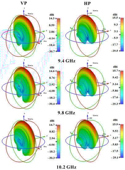 Simulated 3D radiation patterns of the VP and HP linear arrays at three operating frequencies of 9.4, 9.8, and 10.2 GHz.