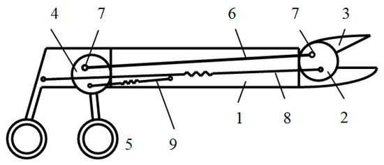 Figure 1 represents a schematic view of the laparoscopic grasper mechanism. The design is based on a rolling-link type mechanism with a single-sided movable jaw (3) attached to a roller (2). A movable handle (5) is fixed to another roller (4). The two rollers of the same radius are placed opposite each other against two plane support areas on the frame (1), one at each end of the frame (1). The connecting rod (6) connects these rollers by means of bearing housings (7). The grasper mechanism contains two springs—the driving spring (8) and the compensation spring (9).