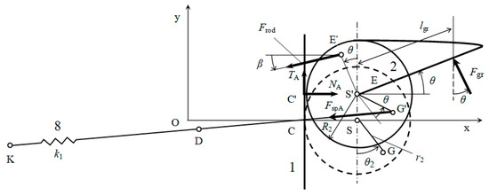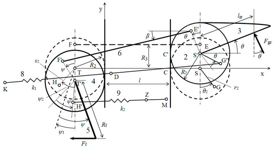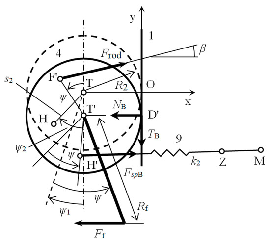 In order to determine the dependence of the force , exerted by the surgeon’s finger on the grasper handle, and on the force acting on the movable jaw, solving the kinematics of the grasper mechanism is first needed (Figure 3). It means the determination of the angular coordinate , determining the angular position of the connecting rod, and the angular coordinate determining position of the roller 4.