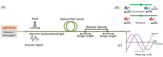 (a) A schematic description of the various components of the DAS system, (b) modifications in the phase difference between the points along the fiber of the signal, (c) the phase-lag between the beat signals (S1 + S2) formed from two scattering points in the fiber in the unstrained (blue) and strained (red) state is proportional to the strain in that section of the fiber.