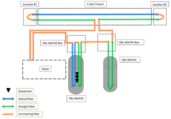 Existing fiber optic cable deployment in CMC Field. Cable was deployed in a loop in two wells and along a surface trench. Obs Well #2 is used to compare with other deployment methods [37].