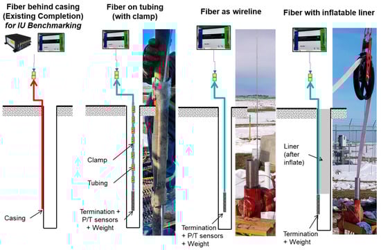 DAS systems can be deployed in different ways in a well, depending on the application and specific requirements of the well [18,19,20]. One common method of DAS deployment in wells is through a “permanently installed” system, where fiber-optic cables are permanently installed in the wellbore during the well construction phase [20]. This method involves embedding the fiber-optic cable within the cement sheath of the wellbore or attaching it to the outside of the production tubing or casing. The advantage of this method is that it provides continuous monitoring of the well over its entire lifetime, enabling early detection of any potential issues.