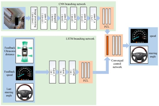 In recent years, the integration of artificial intelligence and intelligent driving has been deepening, and end-to-end deep learning methods have received much attention in intelligent driving. The end-to-end deep learning-based intelligent driving network model exhibits the following features: it operates in an “environment perception-control execution” mode for vehicle motion planning and control, utilizes supervised learning techniques to learn human driving actions and behaviors, and directly maps sensor data to control variables such as an accelerator pedal, steering wheel, and the brake pedal. This approach effectively minimizes system complexity and enhances the actual time performance [16]. Dosovitskiy, Ros, Codevilla, Lopez, and Koltun proposed Convolutional Neural Networks (CNNs) for processing image data to achieve autonomous driving [17]. Xu et al. further proposed a network architecture of Fully Convolutional Network–Long Short-Term Memory (FCN-LSTM) to enhance the model’s understanding of environments and achieve the prediction of discrete or continuous vehicle actions [18]. Hecker et al. End2End learning used a surround-view camera [19]. Pinpin Qin et al. proposed a CNN-LSTM-based car tracking model, which is able to car tracking process of the potential relationship between the car in front and the car behind, and compared with the classic car following models (LSTM model, intelligent driver model), and proved that the accuracy and the ability to learn heterogeneity of the proposed model are better than the other two models [20].
