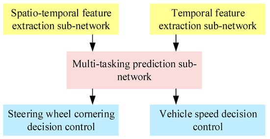 - Multi-task prediction sub-network: in end-to-end intelligent driving control decision-making methods, the steering wheel angle and vehicle speed control decisions belong to multi-task learning. Multi-task learning belongs to the recommendation task, which improves the generalization ability by sharing representation information among related tasks to enable the network to better generalize the initial task [23]. The vehicle speed and steering angle prediction information is output by fusing the spatial and temporal features to achieve horizontal and vertical vehicle control. The proposed multi-task prediction sub-network is shown in Figure 2.