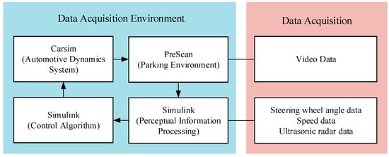 In this study, the driver’s parking control within the simulated parking environment is achieved using the Logitech G29 driving simulator. Parking loop views are recorded with PreScan’s integrated video recording function, while the car dynamics model is built using Carsim, replacing the in-built car model in PreScan. The steering wheel angle, vehicle speed, and ultrasonic radar distance data for the simulated car are recorded through Simulink. Each frame of the surround-view data and ultrasonic sensor data collected by the simulation platform automatically match the corresponding driving decision, eliminating the need for additional space–time synchronization.