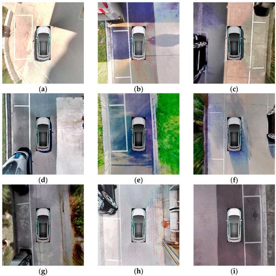 Parking environment for capturing intelligent parking driving models: (a) Strong light illumination and curbstone obstacles; (b) front-side vehicle obstacle and curbstone obstacles; (c) front and left-side vehicle obstacle and curbstone obstacles; (d) vehicle obstacle and curbstone obstacles and covered parking slot lines; (e) left- and right-side curbstone obstacles; (f) right-side vehicle obstacle and curbstone obstacles and fuzzy parking slot line; (g) rainy day; (h) sunny day; and (i) ideal parking environment.