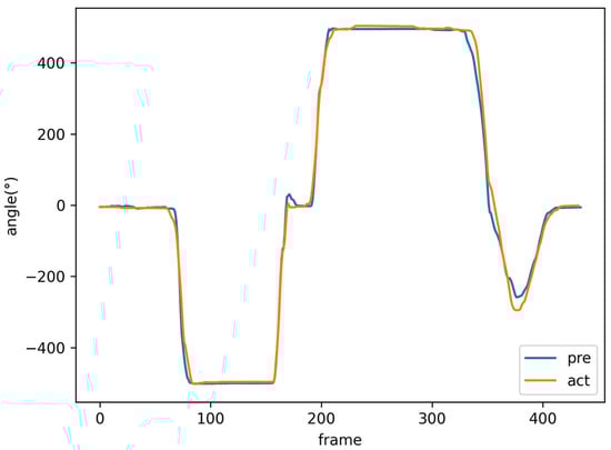 Figure 11 and Figure 12 show the comparison between the predicted and actual steering wheel angle curves, where the orange curve indicates the actual curve and the blue curve indicates the predicted curve. By comparing the two curves, it can be found that the prediction curve of the CNN model does not fit the actual curve well from the overall perspective.