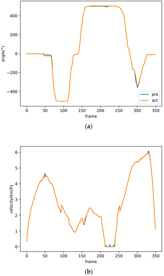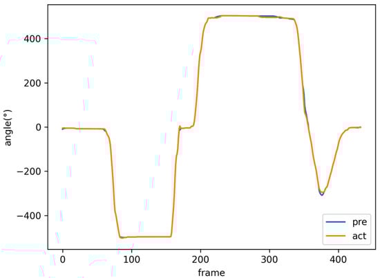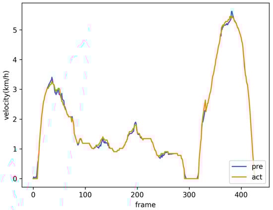 Next, the speed prediction performance was evaluated, and the mean square error value of the CNN-LSTM model for speed was calculated to be 0.00309. A total of 391 frames from the test set were selected to compare the speed prediction curve and the actual curve, as shown in Figure 13. It can be seen from the figure that the predicted curve fits the actual curve well.