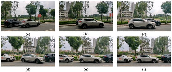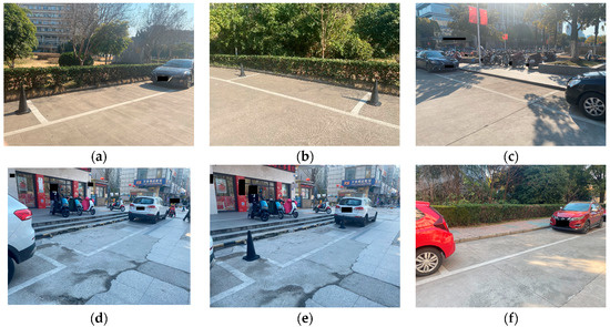 Actual parallel parking slot: (a) Vehicle obstacle, columnar obstacle, and curbstone obstacles; (b) columnar obstacle and curbstone obstacles; (c) vehicle obstacle and curbstone obstacles; (d) vehicle obstacle and fuzzy parking slot line; (e) vehicle obstacle and columnar obstacle and fuzzy parking slot line; and (f) vehicle obstacle and covered parking slot lines.