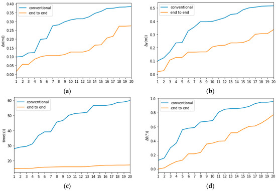 Comparison of 20 sets of parking data between conventional and end-to-end intelligent parking: (a) x; (b) y; (c) time; and (d) .